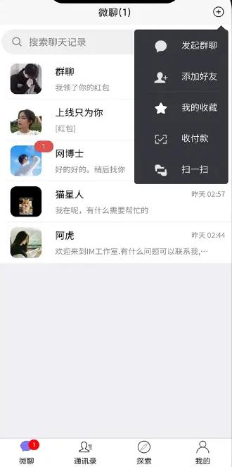 支持文字、表情、圖片、語音、音視頻通話、單聊、群聊、探索、朋友圈、紅包等完備的IM功能。